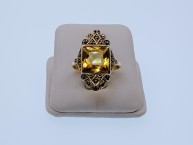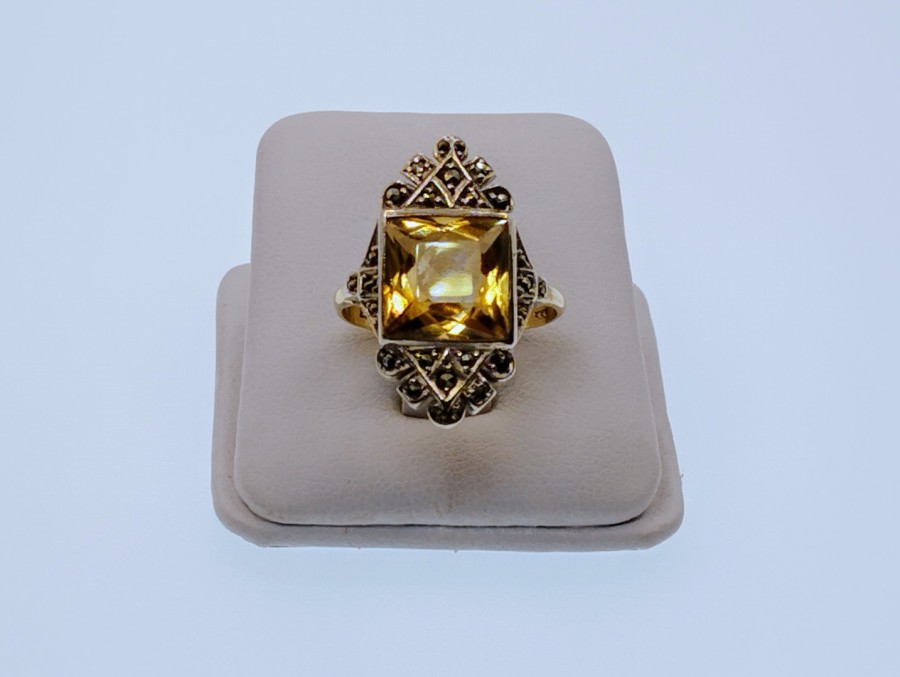 Die Ringschiene wurde aus 333er Gold gefertigt. Der Ringkopf besteht aus Weißgold. Der wunderschön große Citrin bildet den Mittelpunkt innerhalb der aufwendig gestalteten Ausformungen, welche jeweils als Raute, Quadrat oder Kreis ausgebildet und mit Markasiten versehen wurden.