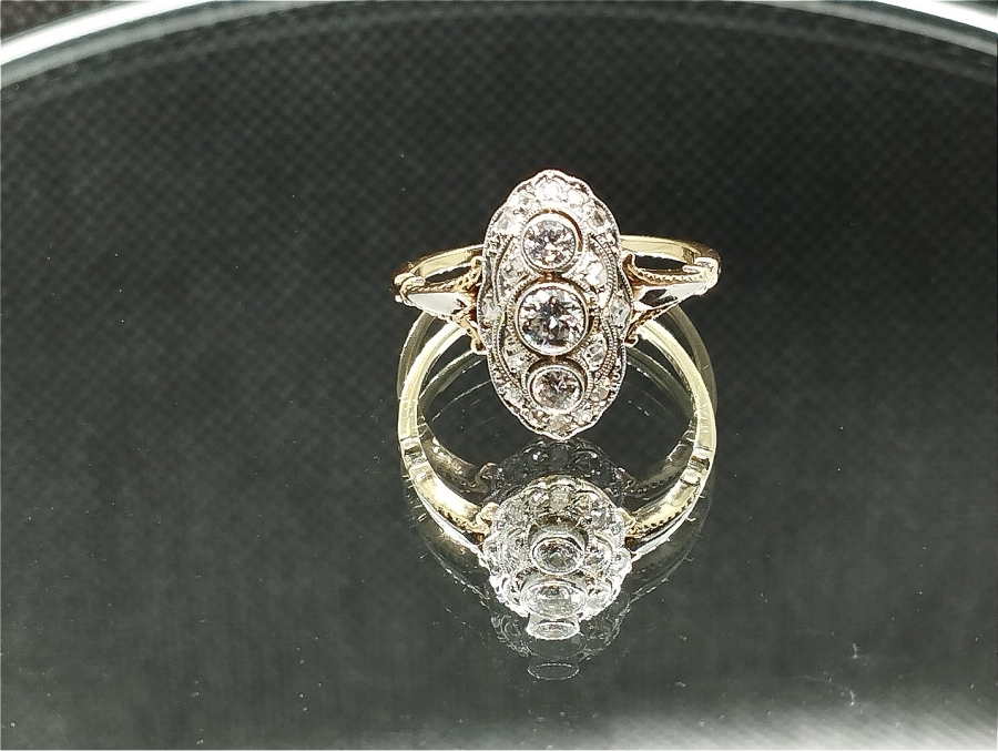 Der navetteförmige Ringkopf ist mit drei größeren Diamanten ausgefasst, umrahmt in fein geschwungener Durchbruchsarbeit von einer Entourage aus weiteren Diamanten. Der Ringkopf sowie die beiden lilienförmigen und in eine schmale Ringschiene auslaufenden Seitenteile wurden mit Platin belegt. Gutachten vorhanden