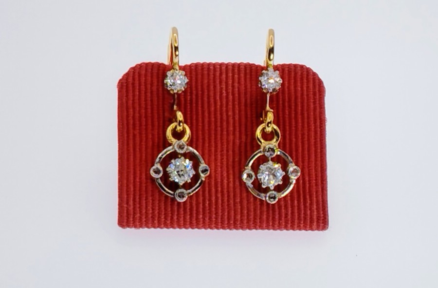 Die zierlichen Ohrhänger wurden mit einem Kreiselement gestaltet, welches durchbrochen und ringsum mit 4 kleinen Diamanten verziert wurde. Darin befindet sich mittig platziert ein einzelner größerer Diamant. Die beweglich montierten Ohrringbrisuren wurden schauseitig mit einem weiteren Diamanten geschmückt. Alle Fassungen sowie die Oberfläche der Kreiselemente wurden mit Platin belegt. Gutachten vorhanden.